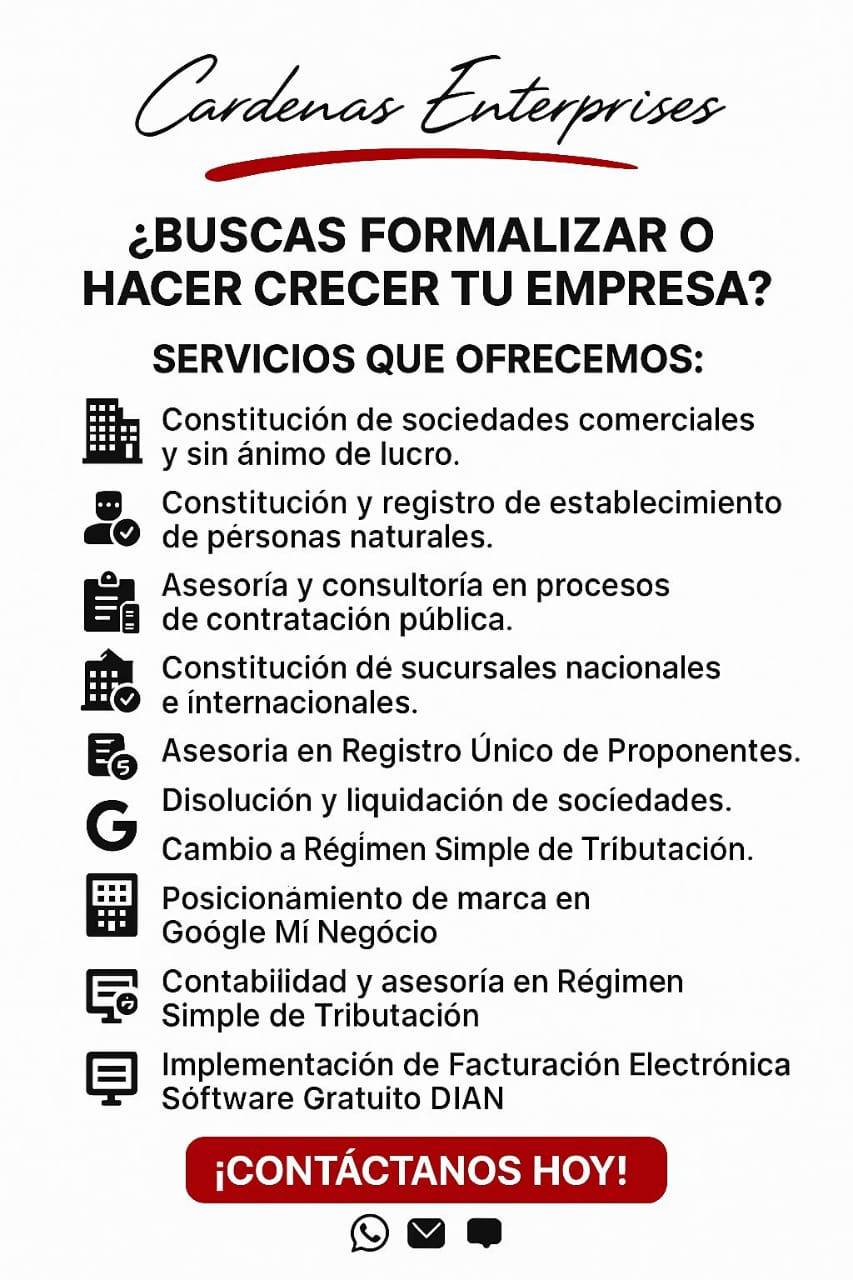 Somos una empresa 100% colombiana nacida bajo el nombre CARDENAS ENTERPRISES, prestando nuestros servicios con los más altos estándares de calidad a nuestros clientes del sector público y privado de todo el país.